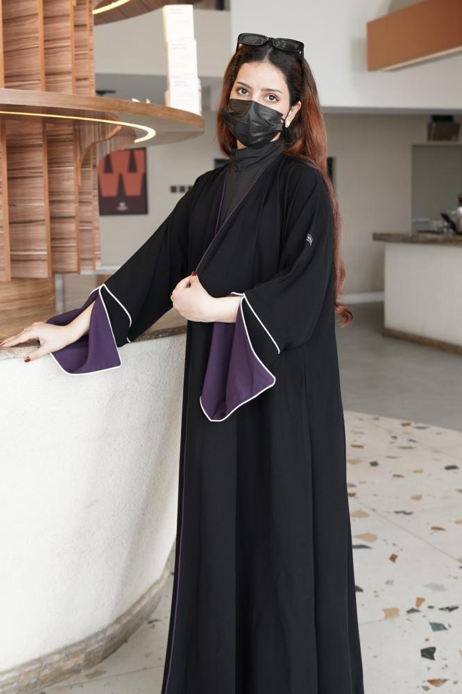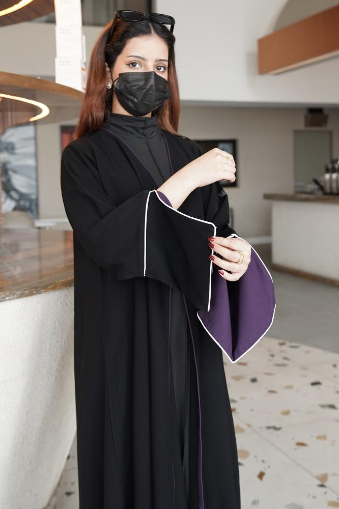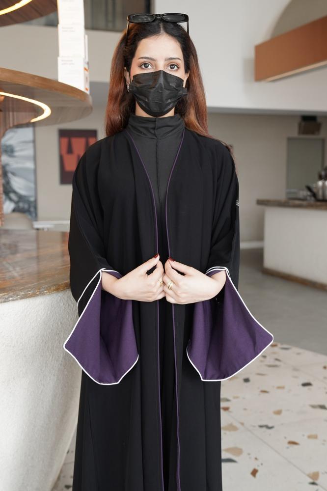 عبايه تصميم مميز وفريد بقماش كريب ملكي وكم باللون البنفسجي والابيض